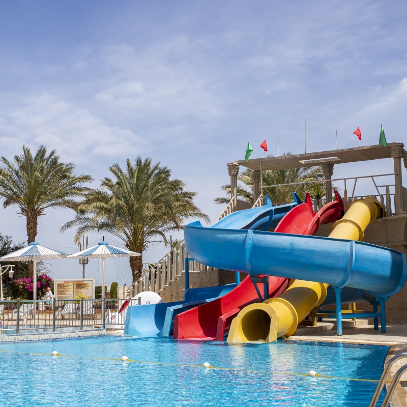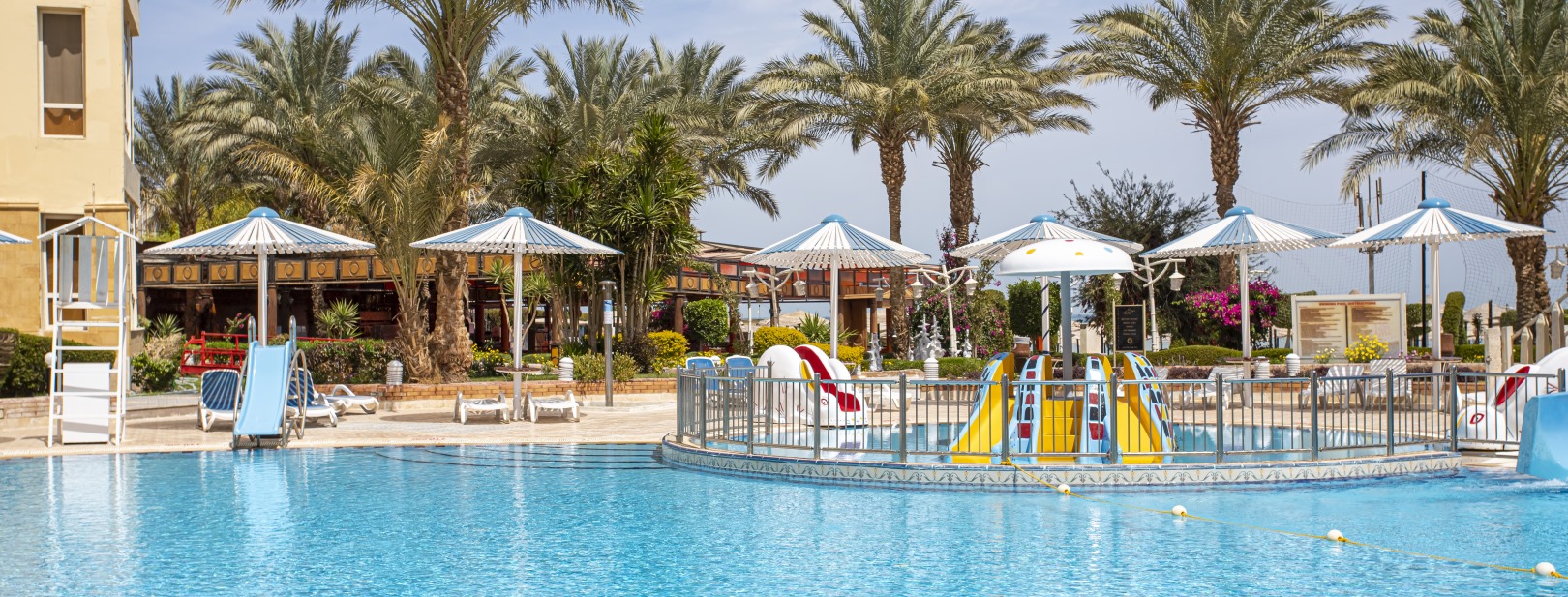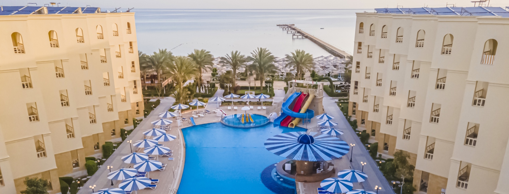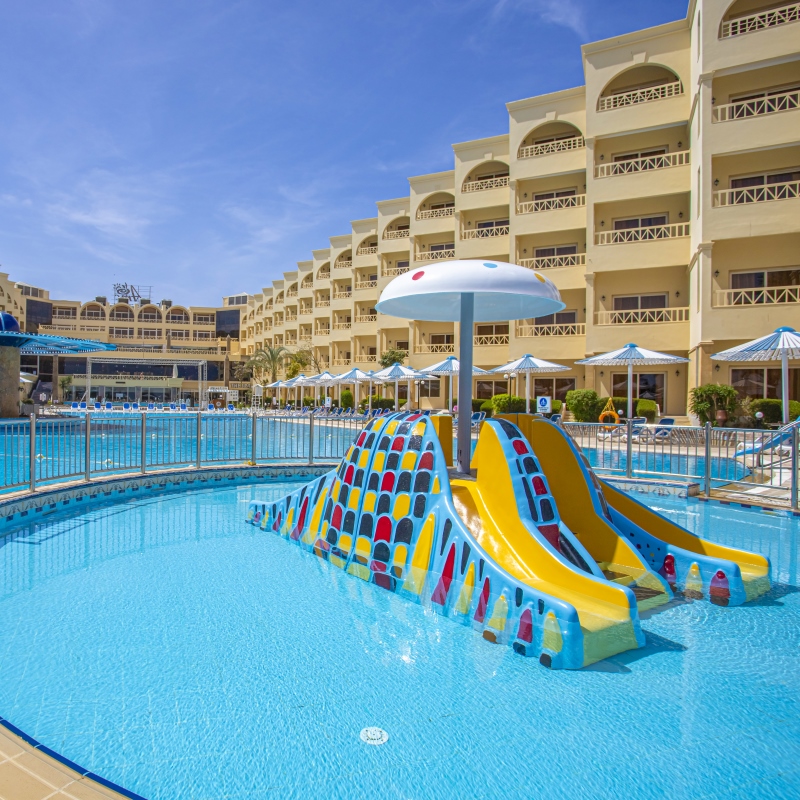 Votre hôtel Le AMC Royal Hotel 5* dispose de plusieurs piscines et de 394 chambres réparties sur 3 bâtiments. Ce magnifique hôtel est situé au bord de la mer Rouge. À votre disposition : réception 24h/24, room service*, wifi gratuit à la réception, boutiques*, blanchisserie*, location de voiture*, parking, service médical*, service de change, prêt de serviettes de plage, parasols, transat.*Avec supplément Votre chambre Vous logerez dans une chambre standard de 34m² pouvant accueillir jusqu’à 3 adultes ou 2 adultes et 2 enfants. Toutes les chambres sont équipées de : balcon ou terrasse, climatisation, chauffage, télévision, téléphone*, salle de bains équipée d’une baignoire ou douche, sèche-cheveux, nécessaire à thé/café, mini bar*, coffre-fort, wifi*.*Avec supplémentDans le cas d'une chambre à usage triple ou quadruple, l'hôtel met à votre disposition une chambre double équipée d'un lit double (ou de 2 lits jumeaux) et de 1 ou deux lits d'appoints (sofa, canapé lit).Moyennant un supplément, vous pourrez également séjourner en chambre avec vue mer (jusqu’à 3 adultes ou 2 adultes et 2 enfants) ou chambre familiale vue piscine (3 adultes et 1 enfant maximum). Restaurants et bars Pendant votre séjour, vous bénéficierez de la formule « tout inclus » qui comprend les repas servis au Blue Lagoon, le restaurant principal de l’hôtel, où vous vous régalerez de buffets internationaux, ainsi que des snacks.Votre formule tout inclus comprend :Petit déjeuner continental : de 05h00 à 07h00Petit déjeuner buffet : de 07h00 à 10h00Déjeuner : de 13h00 à 15h00Dîner : de 19h00 à 22h00Snacks : de 15h00 à 17h00 au Palm Island Vous aurez également la possibilité de prendre vos repas aux restaurants à la carte Palm Island, Kona Kai Asian Restaurant et The Cesar (spécialités italiennes de 19h00 à 22h00 puis buffet de 23h00 à 02h00) moyennant un supplément et sur réservation.Vous pourrez également profiter de 3 bars et de la discothèque :Palm Island Bar : de 10h00 à 17h00Sphinx bar : 24h/24 (pas de boissons alcoolisées servies entre minuit et 10h00)Bar de la piscine : de 10h00 à 17h00Discothèque : de 23h00 à 01h00 À noter : les horaires sont donnés à titre indicatif et peuvent être soumis à modification sans préavis. Les boissons alcoolisées importées, les jus de fruits frais, les boissons en canettes en en bouteille ne sont pas incluses dans la formule. Restaurants à la carte avec supplément et réservation obligatoire. Vos activités et loisirs Les animateurs de l’hôtel vous proposeront des activités sportives et ludiques en journée, ainsi que des animations nocturnes. Profitez des nombreuses activités et équipements qui vous sont proposés : piscine, piscine pour enfant, mini aquapark (de 10h00 à 13h00 et de 15h00 à 18h00), fléchettes, billard*, tennis de table, baby-foot, bateau à pédales, snorkeling*, beach-volley, sauna*, massages*, hammam*, sports nautiques sur la plage*, plongée sous-marine*, windsurf*, banana boat*, salle de fitness, discothèque, spectacles.*Avec supplémentPour les enfants : une équipe dédiée accueillera au mini-club vos enfants de 4 à 12 ans et leur proposera des activités adaptées à leur âge de 10h15 à 12h30 et 15h15 à 17h00.À noter qu’au vu de la météo, certains équipements extérieurs peuvent ne pas être praticables et certaines activités annulées. Les activités, sports et soirées sont encadrées par une équipe d’animation internationale. Locate Situation À 17 km de l’aéroport Hurghada, AMC Roayal Hôtel est idéalement situé au bord de la mer Rouge, dans le quartier d’Alahyaa, à 11 km du centre de Hurghada.