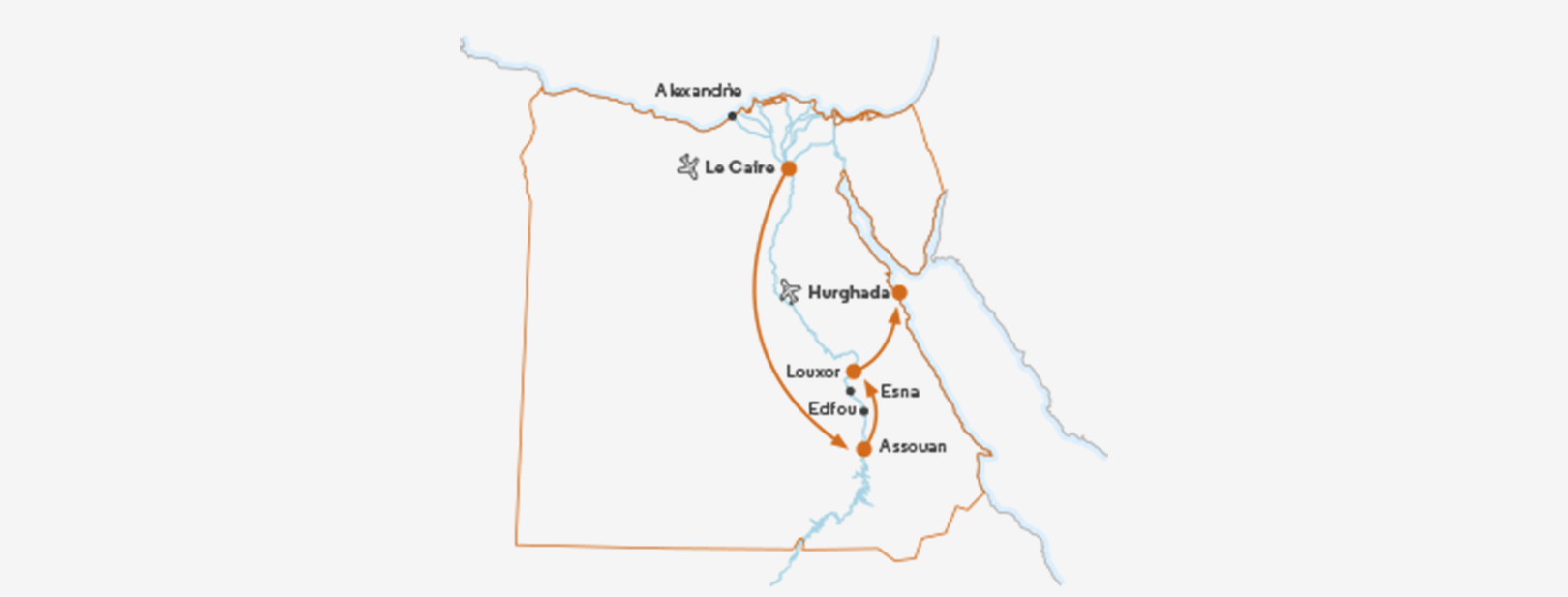 Votre itinéraire en bref Jour 1 : France / LouxorJour 2 : Louxor / EdfouJour 3 : Edfou /AssouanJour 4 : AssouanJour 5 : AssouanJour 6 : Assouan / Kôm Ombo / EdfouJour 7 : Edfou / LouxorJour 8 : Louxor / France Votre bateau - Le Casa Sol (ou similaire) Le bateau compte 58 cabines réparties sur plusieurs ponts. Pour un séjour tout en confort, nous vous garantissons un hébergement dans les cabines situées sur le pont principal ou supérieur, dotées de fenêtres à ouverture partielle.Spacieuses (environ 18 m²), toutes les cabines disposent d’une salle de bains privative, d’une climatisation individuelle, d’un minibar (avec supplément), d’un sèche-cheveux et d’une télévision par satellite. Elles peuvent accueillir jusqu’à 2 adultes et 1 enfant.Le pont soleil vous invite à la détente avec sa piscine extérieure, ses chaises longues, ses parasols, son bain à remous, ainsi qu’un bar où vous pourrez siroter une boisson fraîche.Lors des après-midis de navigation, une pause gourmande vous est proposée avec thé et petits gâteaux.Les repas sont servis sous forme de buffet dans le restaurant du bord, où vous découvrirez chaque jour les spécialités du chef. (Boissons en supplément.)Si vous voyagez en cabine triple, vous serez logé dans une cabine double équipée d’un lit double (ou de deux lits simples) et d’un lit d’appoint.Services disponibles avec supplément : connexion internet (bas débit), boutiques, téléphone, massages, boissons, blanchisserie. Votre croisière en détail Jour 1 : FRANCE - LOUXOR Vol à destination de Louxor. À votre arrivée, accueil par notre correspondant local qui vous assistera pour les formalités d’entrée et l’obtention du visa. Transfert vers votre bateau 5* Le Casa Sol (ou similaire) et installation dans votre cabine. Dîner et nuit à quai à Louxor. Jour 2 : LOUXOR-EDFOUAprès le petit déjeuner, partez à la découverte de la nécropole thébaine, majestueuse cité des morts où vous visiterez les colosses de Memnon, vestiges grandioses du temple disparu d’Amenhotep III ainsi que la vallée des Reines, lieu de sépulture des épouses royales. Excursions en option :La vallée des Rois : poursuivez votre exploration des sites funéraires par le plus célèbre de tous ! Vous découvrirez des tombeaux étonnamment bien préservés et notamment celui de Ramsès III. Le temple d’Hatchepsout : imposant temple funéraire incrusté dans la falaise, dédié à l’une des rares femmes pharaons de l’histoire égyptienne. Retour à bord pour le déjeuner. Navigation vers Edfou Dîner et nuit à bord Jour 3 : EDFOU - ASSOUANPetit déjeuner à bord puis départ pour la visite du temple d’Horus.C’est le temple le mieux conservé d’Égypte, avec ses murs d’enceinte intacts, ses chambres et ses cryptes remarquablement préservées. Laissez-vous impressionner par ses colonnes finement sculptées et ses imposants pylônes, qui racontent l’une des plus célèbres batailles de l’Égypte antique – une histoire captivante que votre guide ne manquera pas de vous faire revivre.Retour au bateau pour le déjeuner. Navigation vers AssouanDîner et nuit à quaiJour 4 : ASSOUAN Petit déjeuner à bord. Matinée libre à Assouan ou excursion optionnelle.Profitez-en pour découvrir Assouan, son centre-ville, ses marchés et bazars. Ils sont notamment réputés pour la qualité de leurs épices : hibiscus, cumin, anis etc … N’hésitez pas à demander à votre guide une fourchette de prix et rappelez-vous que le marchandage fait partie des coutumes. Il faut se prêter au jeu pour faire les meilleures affaires.Excursion en option : le temple d’Isis sur l'île de Philae : il compte parmi les derniers joyaux construits dans l’Antiquité égyptienne. Édifié au IVe siècle avant notre ère et achevé sous l’Empire romain, il incarne la transition entre deux civilisations. Submergé pendant 15 ans après la construction du barrage d’Assouan, ce chef-d’œuvre a été sauvé in extremis dans les années 1970, déplacé pierre par pierre sur une île voisine en surplomb du NilRetour au bateau pour le déjeunerDans l’après-midi, embarquez pour une balade en felouque, ces voiliers traditionnels qui voguent paisiblement entre les îles du Nil.Excursion en option : Village nubien et jardin botanique : prolongez la balade en felouque vers un authentique village nubien pour une immersion culturelle chaleureuse. Retour au bateau, dîner et nuit à bord Jour 5 : ASSOUAN Petit déjeuner à bord. Matinée libre à Assouan ou excursion optionnelleExcursion en option : Le Temple d’Abou Simbel (en bus) : départ matinal pour le temple d’Abou Simbel (3h de bus). C’est sans nul doute le plus beau temple d’Egypte de par son architecture et son histoire. Bâti par Ramsès II il y a plus de 3200 ans, il a été déplacé et reconstruit pierre par pierre dans les années 60 pour le sauver des eaux du Lac Nasser. N’oubliez pas de passer par le musée après votre visite pour voir le film de cet extraordinaire chantier. Retour en bus au bateau pour le déjeuner. Dîner et nuit à quai Excursion en option le soir : Spectacle son et lumières à Philae : l’épopée de la déesse Isis voulant sauver son époux le Dieu Osiris vous sera contée dans un cadre magique.Jour 6 : ASSOUAN - KOM OMBO - EDFOU Petit déjeuner à bord.Matinée libre à Assouan Déjeuner à bord et navigation vers Kôm Ombo pour la visite du temple. Rares sont les temples dédiés à Sobek, le dieu à tête de crocodile, et celui de Kôm Ombo en est l’un des plus fascinants. Perché sur une hauteur dominant le Nil, il offre un panorama spectaculaire et dévoile de nombreuses scènes de la vie quotidienne de l’époque. Ne manquez pas d’observer le bas-relief représentant des instruments de chirurgie : vous serez étonné de constater à quel point certains ont peu changé en plus de 2 000 ansContinuation vers Edfou.Dîner et nuit à bord Jour 7 : E