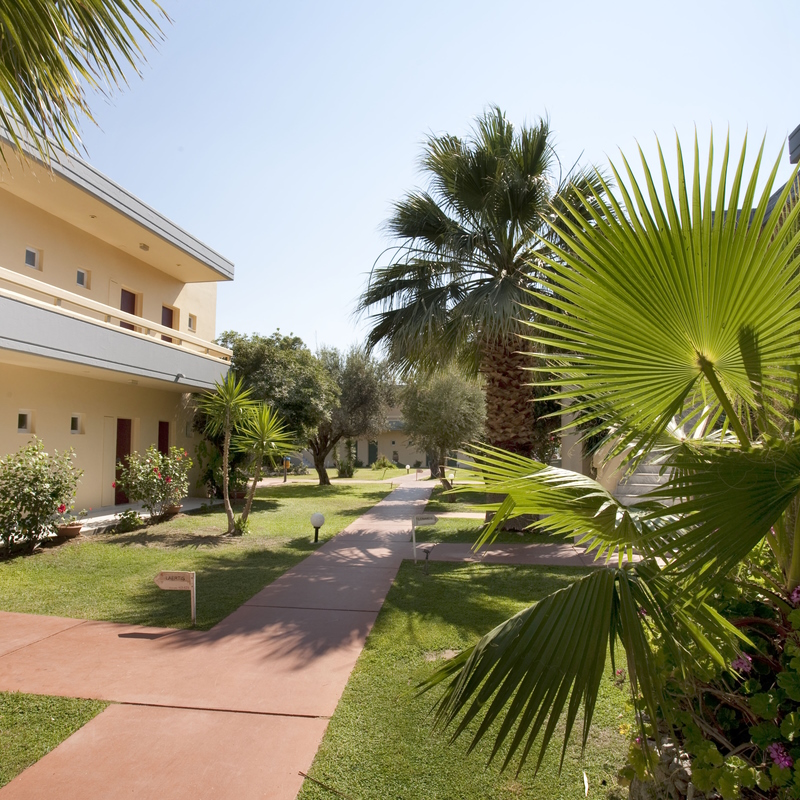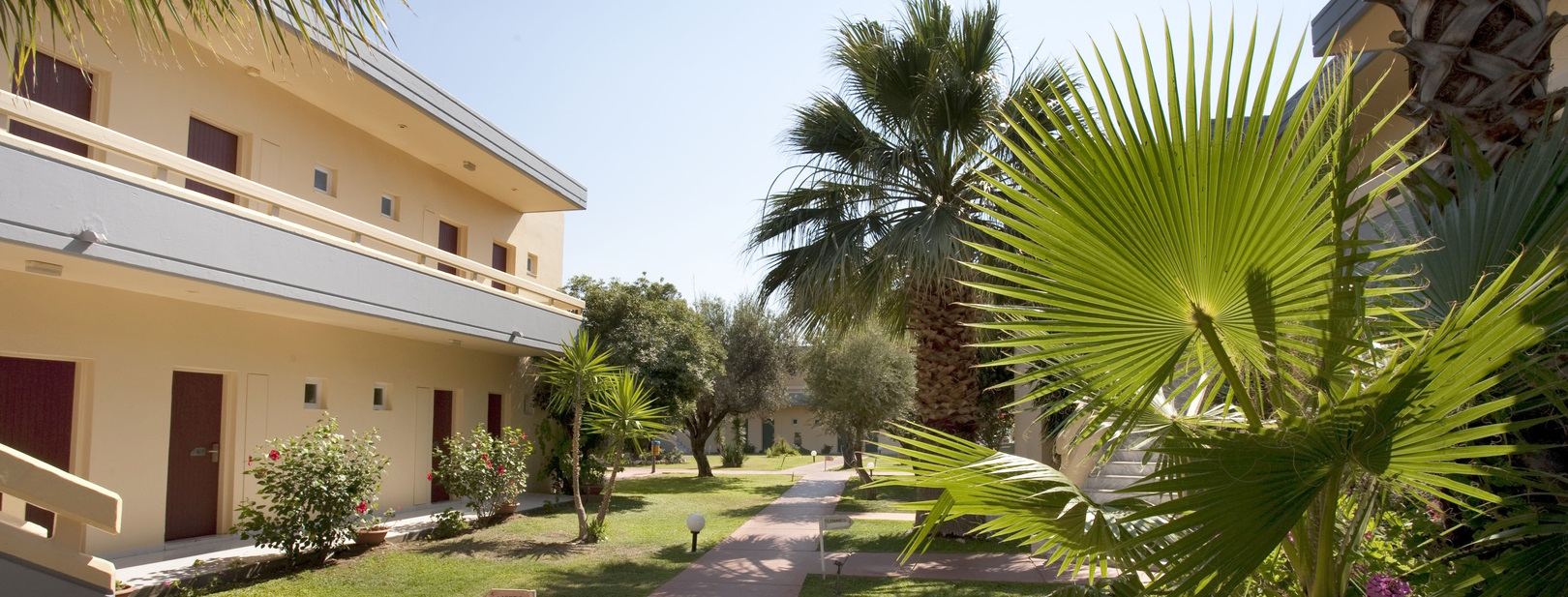 allée avec palmiers, végétation luxuriante, lampe, bâtiments de l'hôtel avec un étage et escalier, ciel bleu