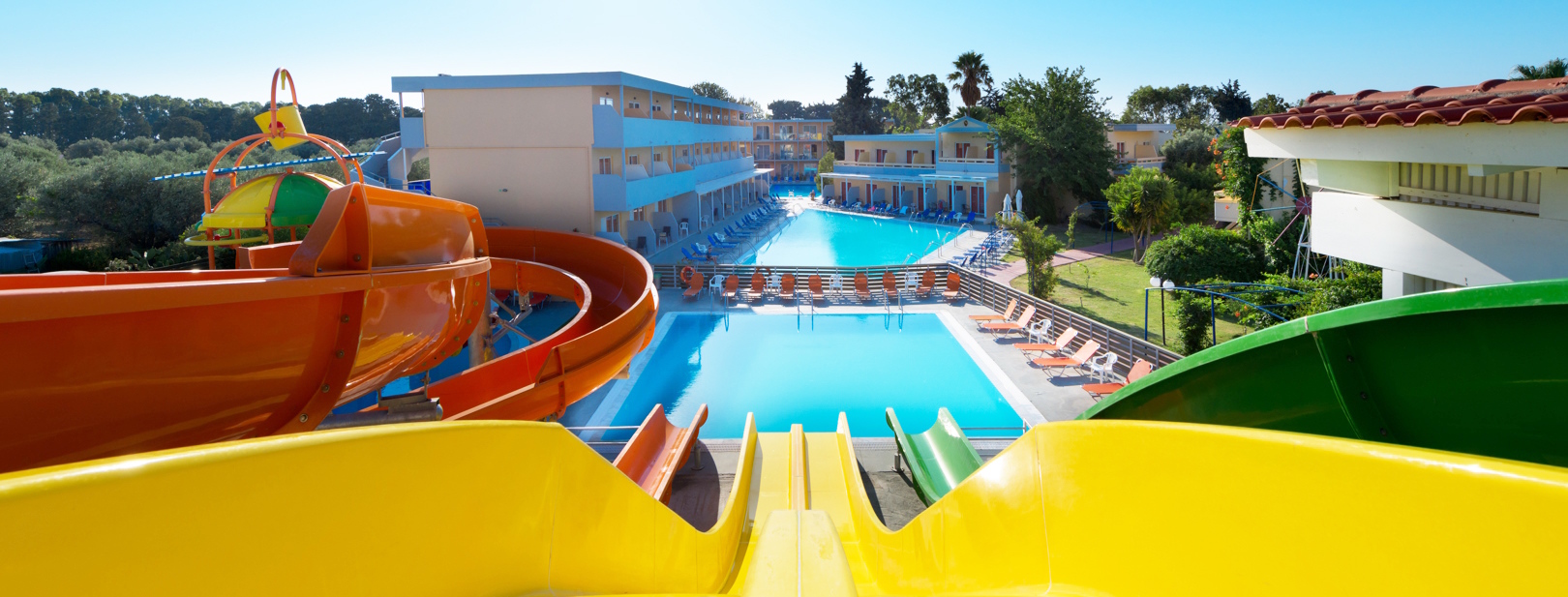 toboggans, deux piscines et transats autour, végétation, plusieurs bâtiments avec deux étages, ciel bleu