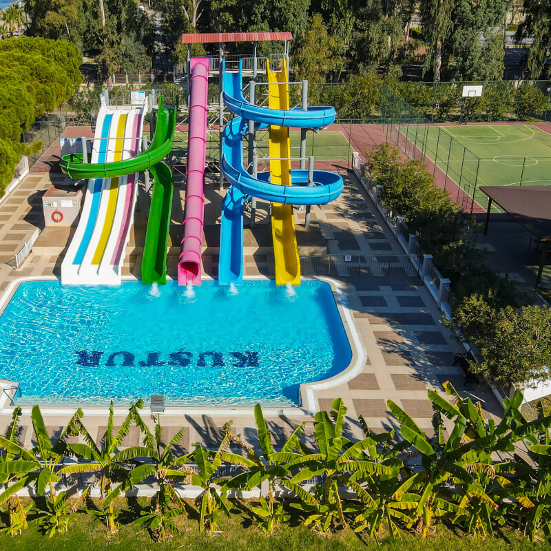 Votre hôtel Le Kustur Club Holiday Village 5* est un club de vacances unique entouré d’une magnifique forêt de pins et de la mer bleu turquoise. De nombreux sites historiques de l’époque gallo-romaine, tels que la cité antique d’Éphèse et son magnifique amphithéâtre, se situent à seulement quelques kilomètres. Il est aujourd’hui composé de 427 chambres et une plage privée possibilité d’y accéder par un passage souterrain, plage de sable de 200 m de long séparée de la plage publique. À votre disposition : Réception 24h/24, amphithéâtre du 25/05 au 30/09, blanchisserie*, service de santé 24h/24*, centre commercial*, coiffeur*, photographe*, location de voiture*, transats et parasols, serviettes de plage, parking, wifi gratuit. *Avec supplémentLes animaux ne sont pas admis dans l’hôtel. Votre chambre Vous logerez dans une chambre standard de 32 m². L’hôtel met à disposition 1 lit double et 1 lit simple. La capacité maximale d’accueil est de 2 adultes + 1 enfant ou 3 adultes. Toutes les chambres sont équipées de : balcon ou terrasse, climatisation, sèche-cheveux, téléphone*, coffre-fort, mini-bar (il est réapprovisionné quotidiennement avec des boissons rafraîchissantes non alcoolisées offertes), télévision par satellite, wifi gratuit.Pour encore plus de confort, vous pouvez également séjourner dans une chambre supérieure, pouvant accueillir jusqu’à 2 adultes + 2 enfants ou 3 adultes + 1 enfant.L’hôtel dispose de 4 chambres PMR, pouvant accueillir jusqu’à 2 adultes + 1 enfant ou 3 adultes (sur demande et selon disponibilités). Restaurants et bars Pendant votre séjour, vous bénéficierez de la formule ultra tout inclus, qui comprend aussi bien les repas, les boissons locales et les snacks. Les repas seront servis sous forme de buffet, au restaurant principal de l’hôtel. Vous pouvez également manger au snack-bar, au pool bar mais également à la plage.Votre formule ultra tout inclus comprend :Petit déjeuner : de 7h00 à 10h00Petit déjeuner tardif : de 10h00 à 11h00Gözleme : de 12h00 à 16h00 (6 jours par semaine, du 16/05 au 30/09)Déjeuner : de 12h30 à 14h00Snack : de 12h00 à 16h00Glaces : de 13h00 à 16h00Cookies : de 17h00 à 18h00Dîner : de 19h00 à 21h00Soupe de nuit : de minuit à 1h00 Vous aurez à disposition également 5 bars :Ada café bar: 24/24Pool bar: de 9h00 à minuitPlage bar: de 9h00 à 17h30Somine bar : de 10h00 à 22h00Disco bar : de 23h00 à 1h00 du 25/05 au 30/095 restaurants à la carte sont ouverts de 19h30 à 22h00 sur réservation (gratuit une fois par séjour dans l’un des restaurants) : Les clients séjournant 7 nuits ou plus ont droit à une réservation à la carte offerte par séjour. Restaurant Panorama du 16/05 au 30/09 (cuisine à base de poissons, cuisine asiatique, cuisine mexicaine)Restaurant Sofra du 02/05 au 14/10 (cuisine turque, cuisine italienne)À noter que la formule ultra tout inclus plus comprend les boissons 24h/24 dans les lieux mentionnés. Les horaires sont donnés à titre indicatif et peuvent être soumis à modification sans préavis. Les jus de fruits frais, les boissons importées, certains cocktails mais aussi les boissons en bouteille ne sont pas compris. Vos activités et loisirs Une animation internationale vous sera proposée par des animateurs. Différents spectacles seront organisés chaque soir dans l’amphithéâtre par l’équipe d’animation (en haute saison uniquement du 25/05 au 30/09). À votre disposition : 3 piscines extérieures, piscine avec toboggans (ouverts de 10h00 à 12h00 et de 14h00 à 16h30), aérobic, basket-ball, fléchettes, tir à l’arc, tennis de table, beach-volley, mini-football, terrain de tennis (éclairage avec supplément), aquagym, salle de jeux* (PlayStation), baby-foot* et billard*.Un centre de spa sera à votre disposition avec les prestations suivantes : sauna, bain turc, salle de fitness, massages* et soins*.Pour les enfants : Un mini-club est à la disposition des enfants de 4 à 12 ans de 10h00 à 12h00 et de 14h00 à 17h00. À leur disposition : aire de jeux, minigolf, mini bowling, cinéma, fabrication de biscuits, tournois, peinture…*Avec supplémentÀ noter qu’au vu de la météo, certains équipements extérieurs peuvent ne pas être praticables et certaines activités annulées. Locate Situation Le Kustur Club Holiday Village 5* se situe à 4 km du centre-ville de Kuşadası et à 70 km de l'aéroport Adnan Menderes.