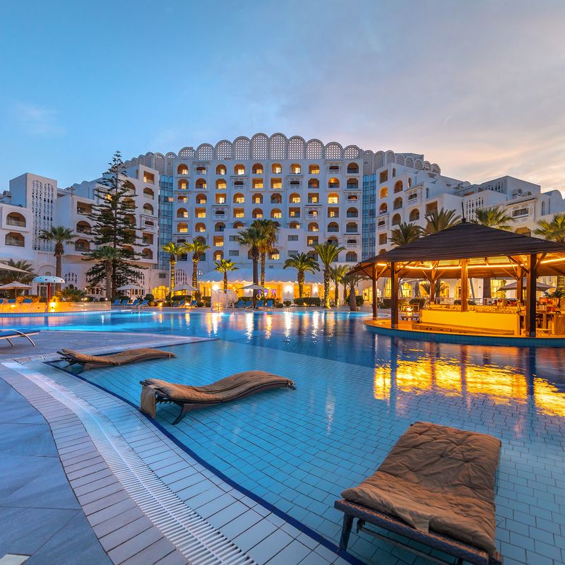 Implanté au bord d’une belle plage de sable, au cœur de la station balnéaire de Port El-Kantaoui, l’hôtel Marhaba Palace se compose de 337 chambres environ réparties dans un bâtiment principal de 7 étages entouré d’une vaste palmeraie. Il possède sa propre plage privée et propose : réception 24h/24, parking, service repassage*, bagagerie, wifi gratuit, boutiques*, service de change, assistance médicale sur demande*, serviettes de plage et piscine (sous caution), chaise longue et matelas au bord de la plage, parasol à la plage et à la piscine.