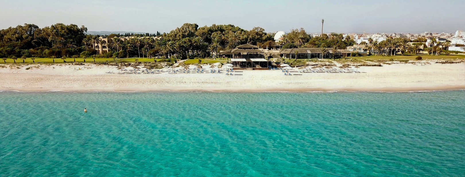Plage de sable avec eau turquoise, transats et palmiers devant un resort entouré de verdure. »