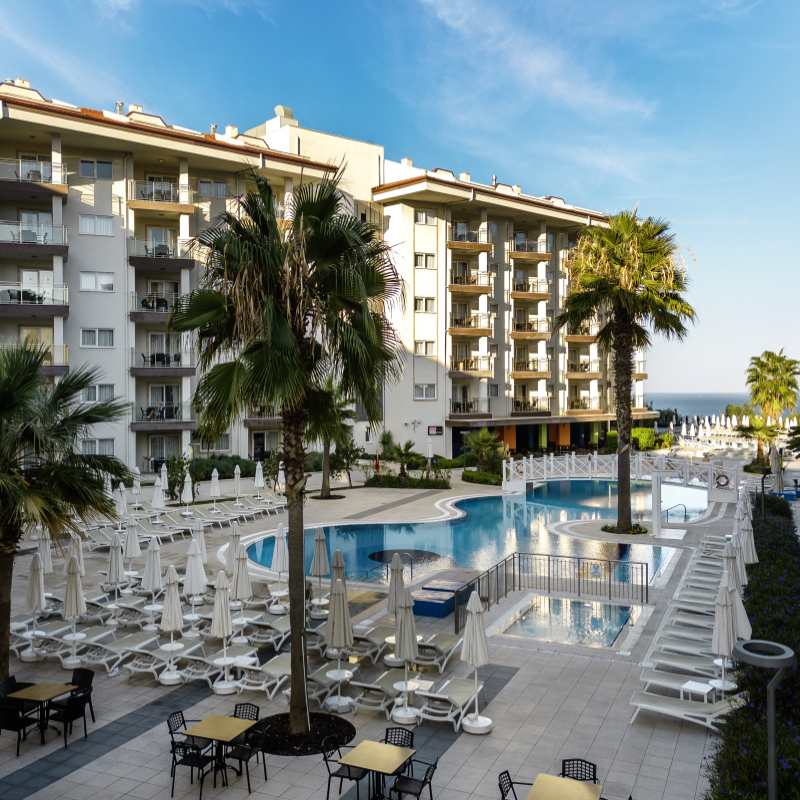 Le Ramada Hotel & Suite 4* construit en 2018, est un magnifique complexe à l’architecture moderne et s’étendant sur une superficie de près de 20 000 m². Il dispose de 270 chambres, réparties sur 4 bâtiments de 6 étages. La plage se trouve à 2,5 km et une navette est mise à disposition pour s’y rendre. À votre disposition : Réception 24h/24, location de voiture*, blanchisserie*, room service*, boutiques, médecin*, coiffeur*, parasols, transats, wifi, navette gratuite pour la plage (du 01/05 au 31/10).