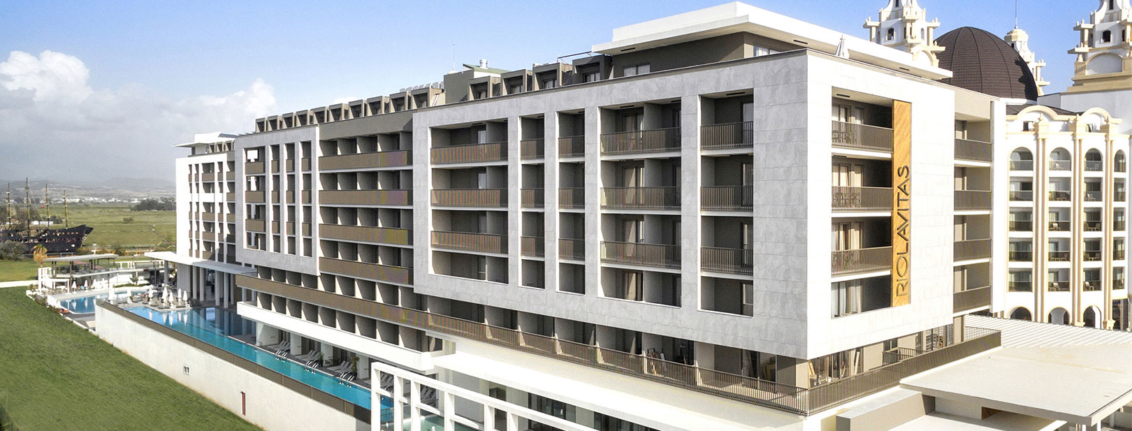 Ouvert en 2016, le Riolavitas 5* est un complexe de 362 chambres réparties dans un bâtiment principal de 8 étages et étendu sur une surface de 17 000m². Vous pourrez rejoindre aisément la plage privée de l’hôtel située à 300 mètres et parcourir les trésors de la ville antique de Side à 8 km. Outre son emplacement stratégique pour de belles découvertes, vous apprécierez la diversité de ses loisirs, du spa aux différentes piscines en passant par les nombreuses activités. À votre disposition : wifi, boutiques*, coiffeur*, salon de beauté*, location de voitures et vélos*, service médical* (sur demande), blanchisserie/nettoyage à sec*, coffre dans la chambre*, babysitting* (sur demande), photographe*, navettes gratuites pour la plage (de 9h00 à 18h00), transats et parasols.