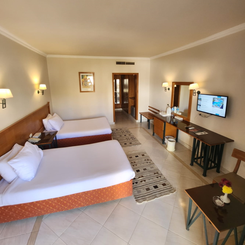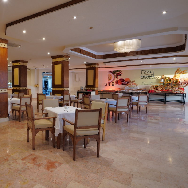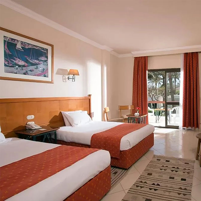 Votre hôtel Le Zya Regina Resort 3*, niché dans un vaste jardin, s’étend le long d’une baie de sable avec un port de plaisance privé. L’hôtel dispose de 417 chambres, à la décoration moderne et met à votre disposition : room service 24h/24, serviettes de plage*, parasols et chaises longues, bureau de change*, wifi gratuit dans le hall de l’hôtel, salle de conférences, salle de banquet, blanchisserie*.* Avec supplément Votre chambre Vous logerez en chambre standard d’environ 33 m², sa capacité maximale est de 3 personnes. La chambre est équipée de : balcon ou terrasse, climatisation, télévision, mini-frigo, coffre-fort, salle de bains équipée avec douche et sèche-cheveux.Dans le cadre d'une chambre à usage triple ou quadruple, vous serez logé en chambre double équipée d'un lit double (ou de 2 lits twins) et de 1 ou 2 lits d'appoint (sofa, canapé lit). Chambre supérieure Chambre supérieure Restaurants et bars Vous séjournerez en formule tout inclus, qui comprend les repas au restaurant principal El Zahra, sous forme de buffet, les boissons alcoolisées ou non et les snacks.Votre formule comprend : Petit déjeuner : de 07h00 à 10h00Petit déjeuner tardif au shark stop bar : de 10h30 à 12h00 Déjeuner : de 13h00 à 15h00Dîner : de 19h00 à 22h00Diner tardif : 22h30 à 00h00Snack : de 13h00 à 17h00 Envie de goûter à d’autres saveurs ? Vous aurez également la possibilité de prendre vos repas dans l’un des restaurants à la carte* de l’hôtel :Restaurant asiatique à la carte* : de 19h00 à 22h00 Restaurant italien à la carte Il Foro* : de 19h00 à 22h00 Pour vous rafraîchir, plusieurs bars seront également à votre disposition :Shark stop bar* : de 10h00 à minuit et de (00h00 à 10h00 (en supplément))Pool bar: de 10h00 à 00h00Beach bar: de 10h00 à 00h00Café Vienna* : boissons chaudes de 10h00 à 16h00 (Glaces en supplément) Discothèque La Rocca* : situé dans le batiment principal* Avec supplémentÀ noter : les horaires sont donnés à titre indicatif et peuvent être soumis à modification sans préavis. Les boissons alcoolisées importées, les jus de fruits frais, les boissons en canette et en bouteille ne sont pas inclus dans la formule. Restaurants à la carte avec supplément et réservation obligatoire. Vos activités et loisirs Pour rendre votre séjour agréable, profitez des nombreuses activités et infrastructures qui vous seront proposées parmi lesquelles : plage privée, 2 piscines de 8h00 au coucher du soleil, Aquapark (ouvert de 10h00 à 13h00 et de 15h00 à 17h00), animations en journée de (10h00 à 12h30 & de 15h00 à 17h00), stretching, pétanque, fléchette, danse, aquagym, volley-ball, tennis de table, mini-discothèque, spectacle, billard*, tennis*, padel*, squash*, salle de sport, spectacles nocturnes, sports aquatiques* et centre de plongée*. Profitez du centre de spa* ouvert de 9h00 à17h00 pour vous accorder un vrai moment de détente et de relaxation grâce aux prestations suivantes : sauna, bain à remous, massages, salon de beauté, bain turc et hammam.* Avec supplément Pour les enfants : mini-club international de 4 à 12 ans de 10h00 à 12h30 et de 15h00 à 16h30. Mini-disco de 20h30 à 21h00.À noter : qu'au vu de la météo et/ou en basse saison, certains équipements extérieurs peuvent ne pas être praticables et certaines activités annulées ou non programmées. Les activités, les sports et les soirées sont encadrées par une équipe d’animation internationale. Locate Situation Sur la promenade Sheraton dans le centre-ville d’Hurghada et directement sur la plage. L’aéroport international d’Hurghada est situé à 10 min en voiture (9 km).